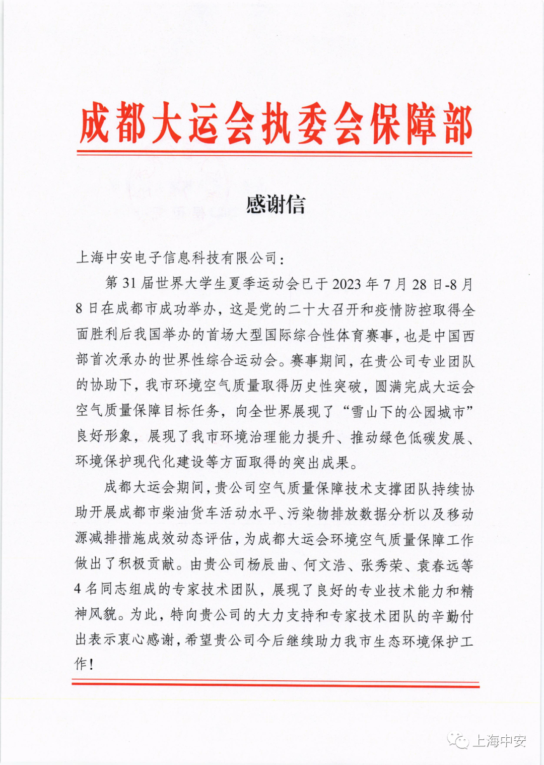 中安科技圓滿完成第31屆世界大學(xué)生夏季運動會空氣質(zhì)量保障任務(wù)?。?023-10-9)